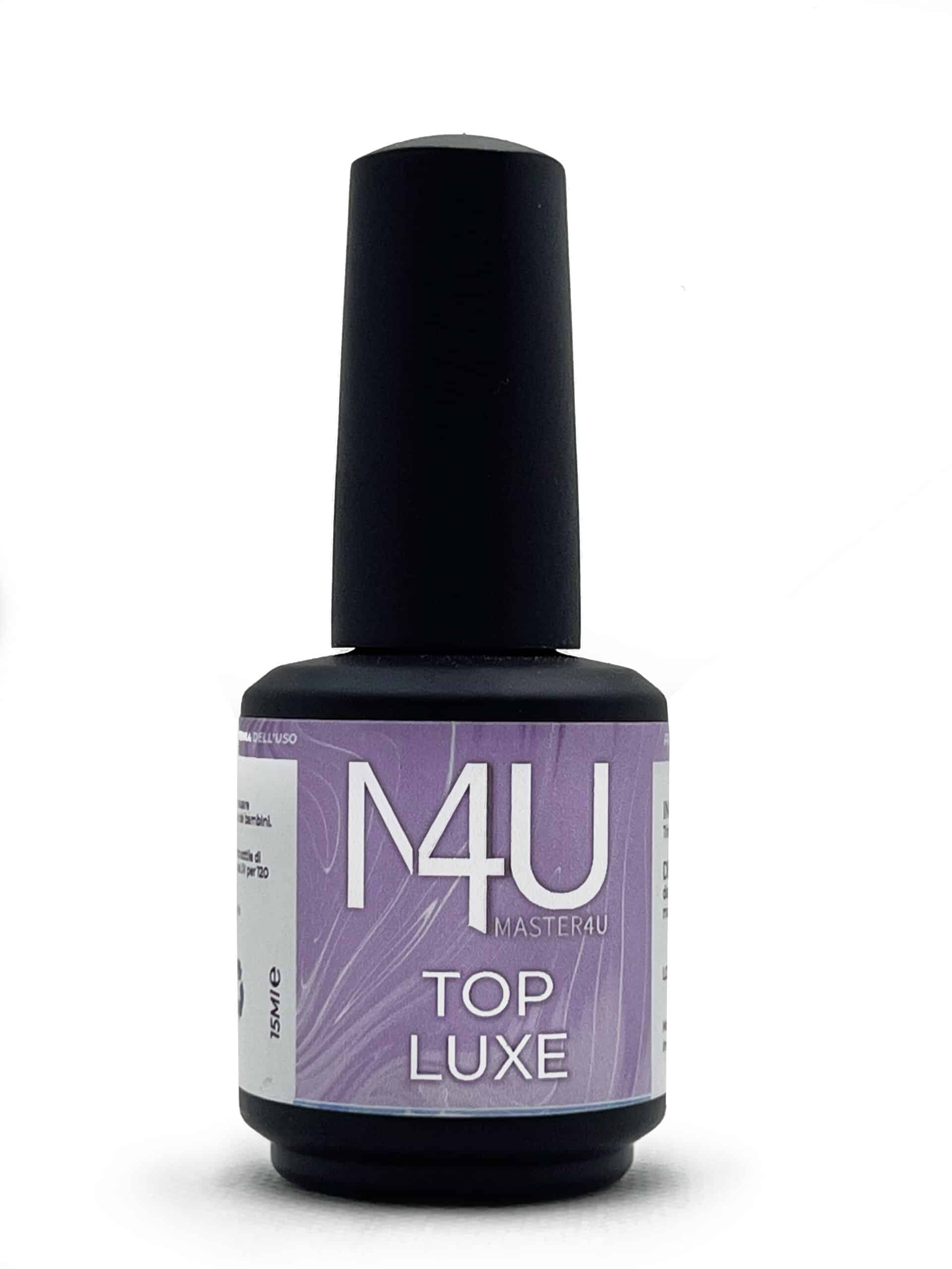 Il TOP LUXE Master4U, è un lucido/sigillante senza dispersione, adatto sia per gel, acrigel o smalto semipermanente. polimerizza in 60 “ LED – 90 “ UV. Dall’effetto brillante e duraturo, non si scheggia e risulta super resistente ed elastico per tutta la durata del trattamento. Consigliatissimo sui colori chiari.